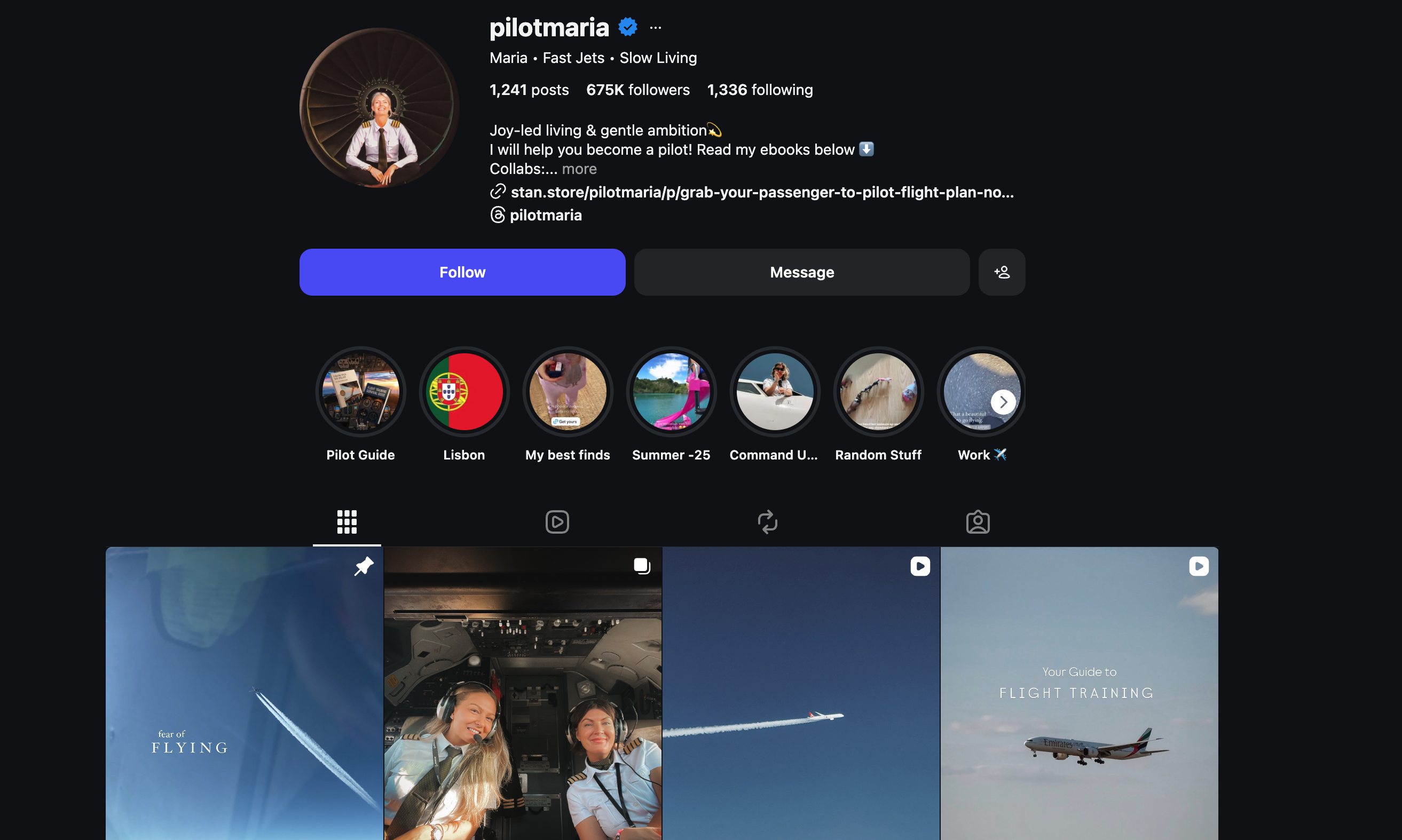 Maria Pettersson is a Swedish-born commercial pilot who started sharing her career on Instagram in 2015 and has built a multi-platform personal brand spanning Instagram, YouTube, and her own website. She's an excellent example of an aviation professional who's built an audience while still actively flying.