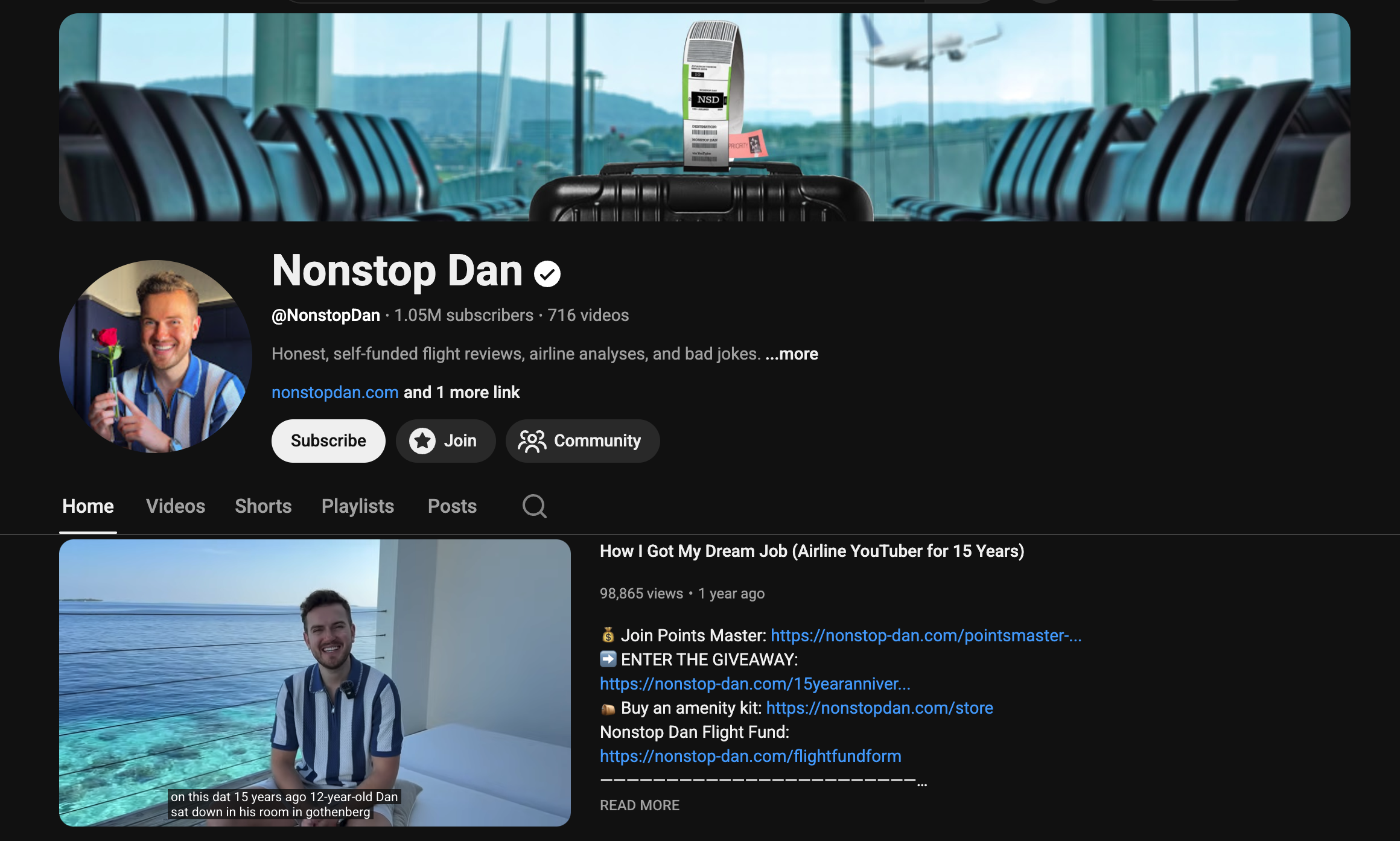 Nonstop Dan, real name Daniel Goz, is a 28-year-old Swedish-American content creator who's built a YouTube channel of around 900,000 subscribers entirely around honest, self-funded flight reviews. His brand is a great counter-example to the assumption that you need brand sponsorships and free flights to build an aviation audience.