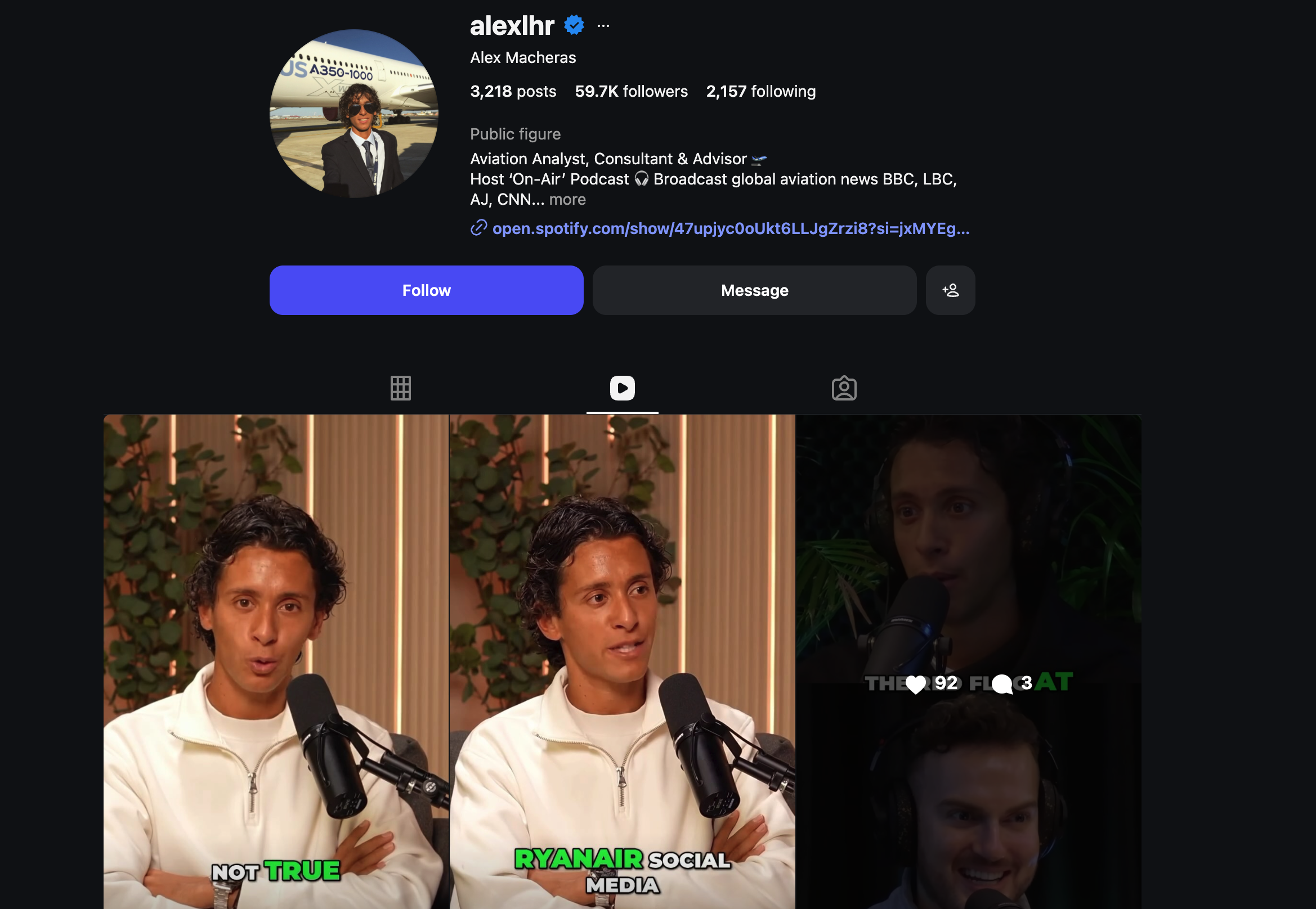 What makes Macheras's brand model worth studying is how it's built on credibility and access rather than scale. He doesn't compete with YouTubers on subscribers — he competes on being the person news networks call when they need an expert opinion on an airline crisis, an aircraft incident, or a major industry development. That positioning compounds over time as every TV appearance reinforces his credibility for the next one.